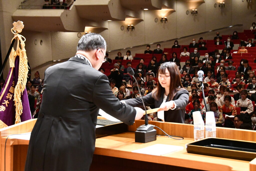 小笠原学長より博士課程を修了し、学位記を授与される松尾小百合さん